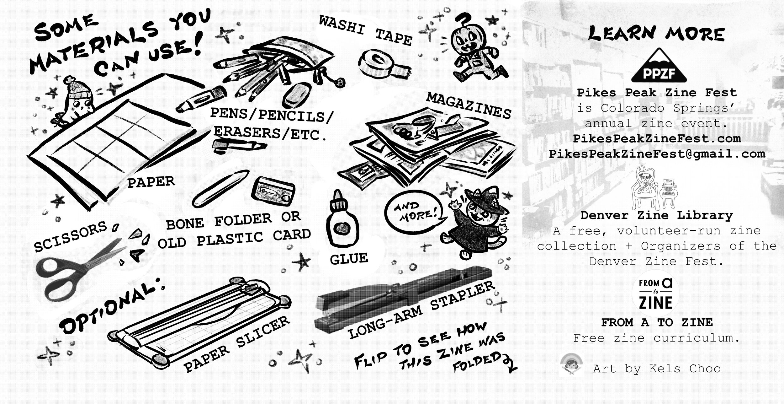 A B/W mini zine introducing new makers to the craft of zine-making! What’s a zine? How do you pronounce it? Why are they good? What do you make a zine with? Read to find out! Originally made for use in Pikes Peak Zine Fest workshops + DIY Zine Kits.
